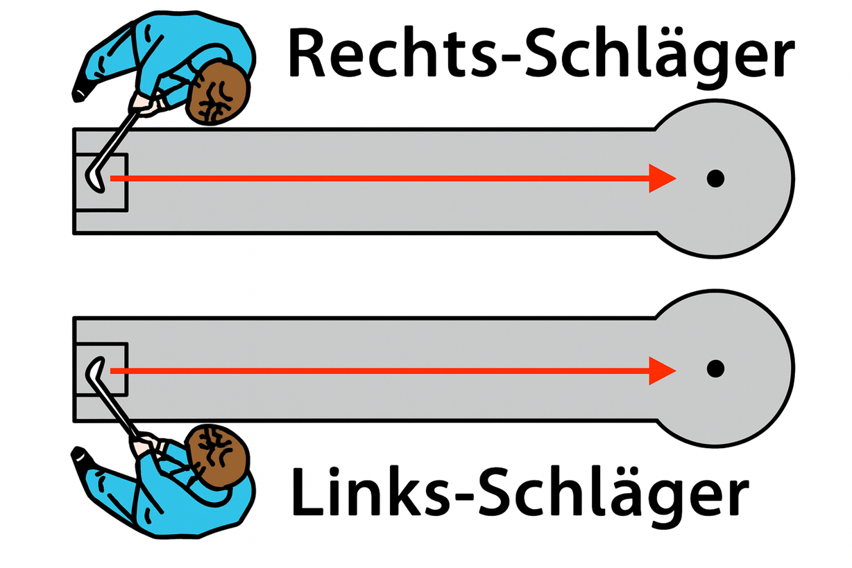 Stell zuerst fest, auf welcher Seite der Bahn du stehst. Nun kannst du ablesen, ob du einen Rechts- oder Linksschläger benötigst.